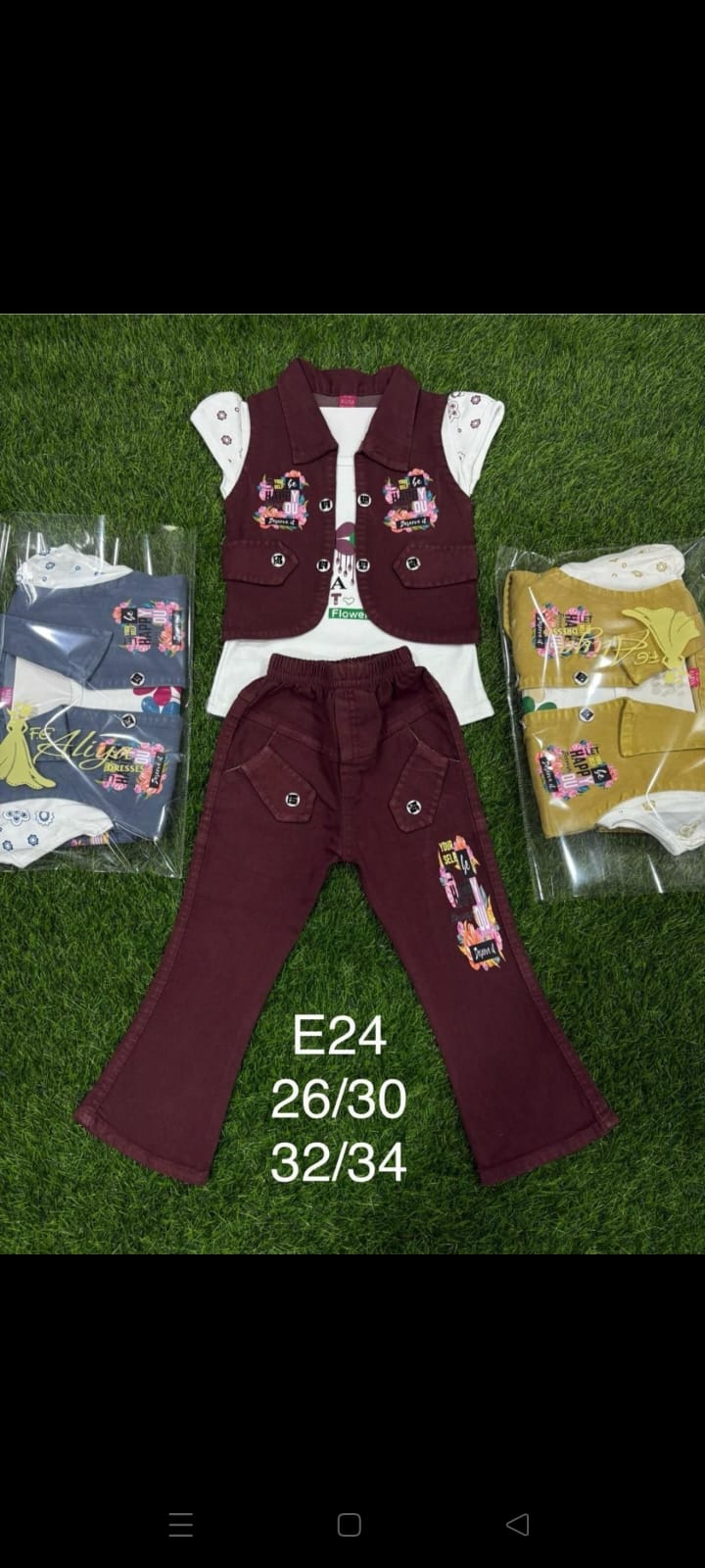 This Trendy 3-piece Girls’ Set Includes A Printed White Top, Stylish Jacket, And Matching Flared Pants.