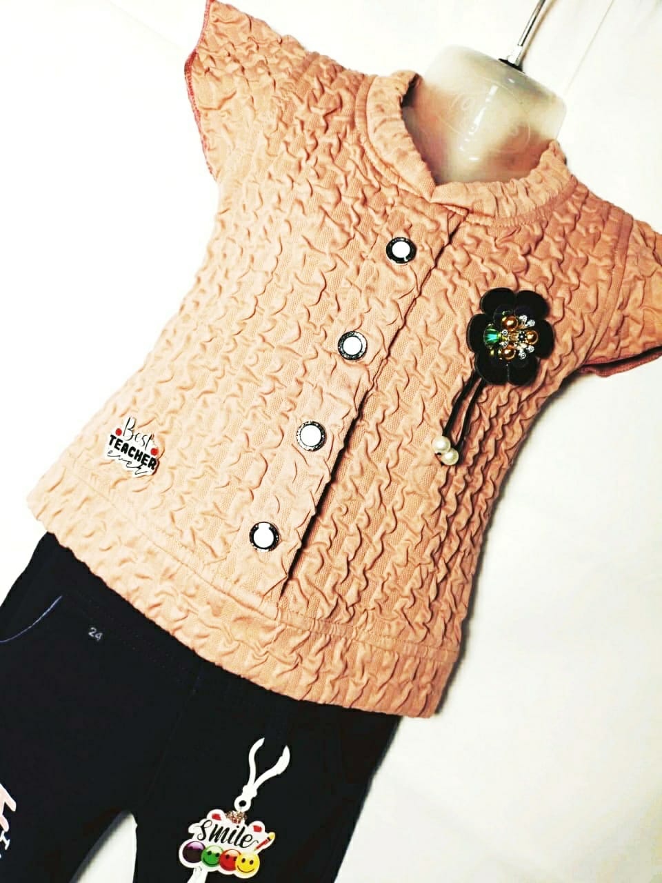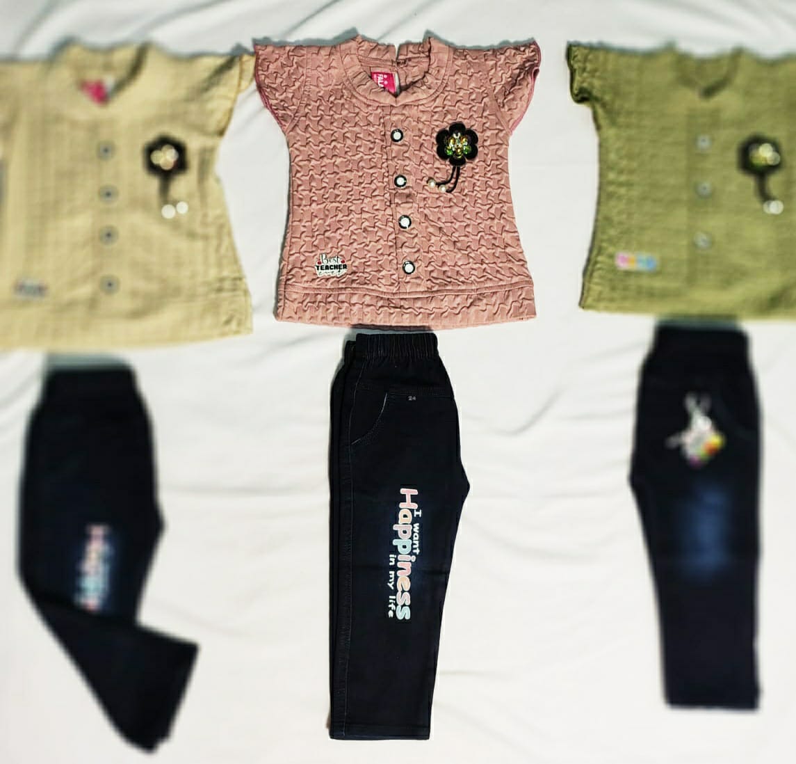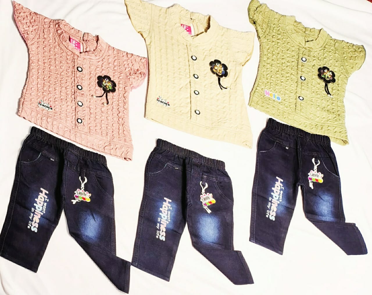 Stylish baby girl outfit sets with textured tops in pink, beige, and olive green shades.