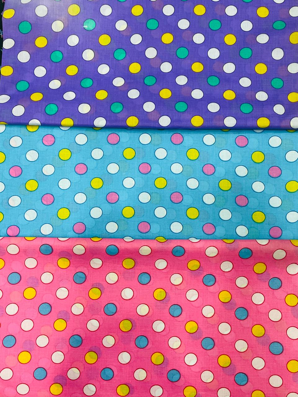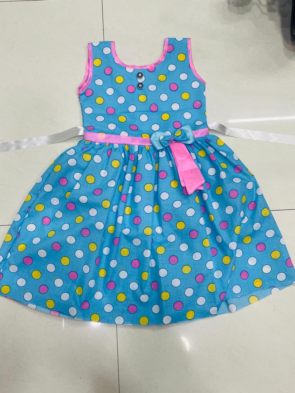 This is a charming sleeveless frock for baby girls in a cheerful blue polka dot print.