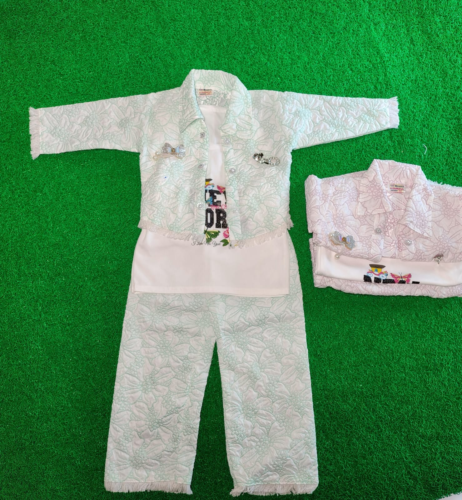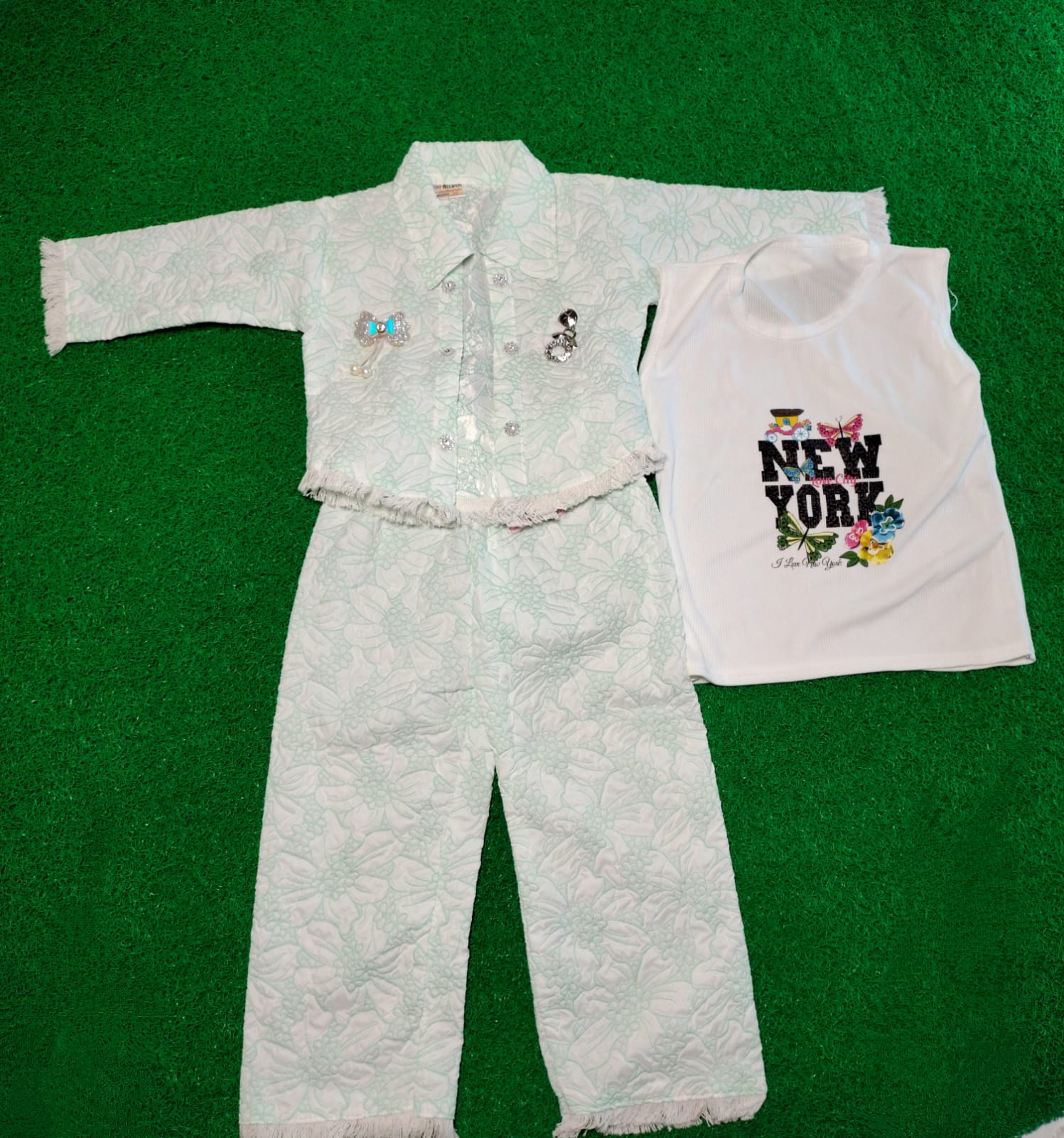 Includes a stylish jacket, printed inner top, and matching pants.